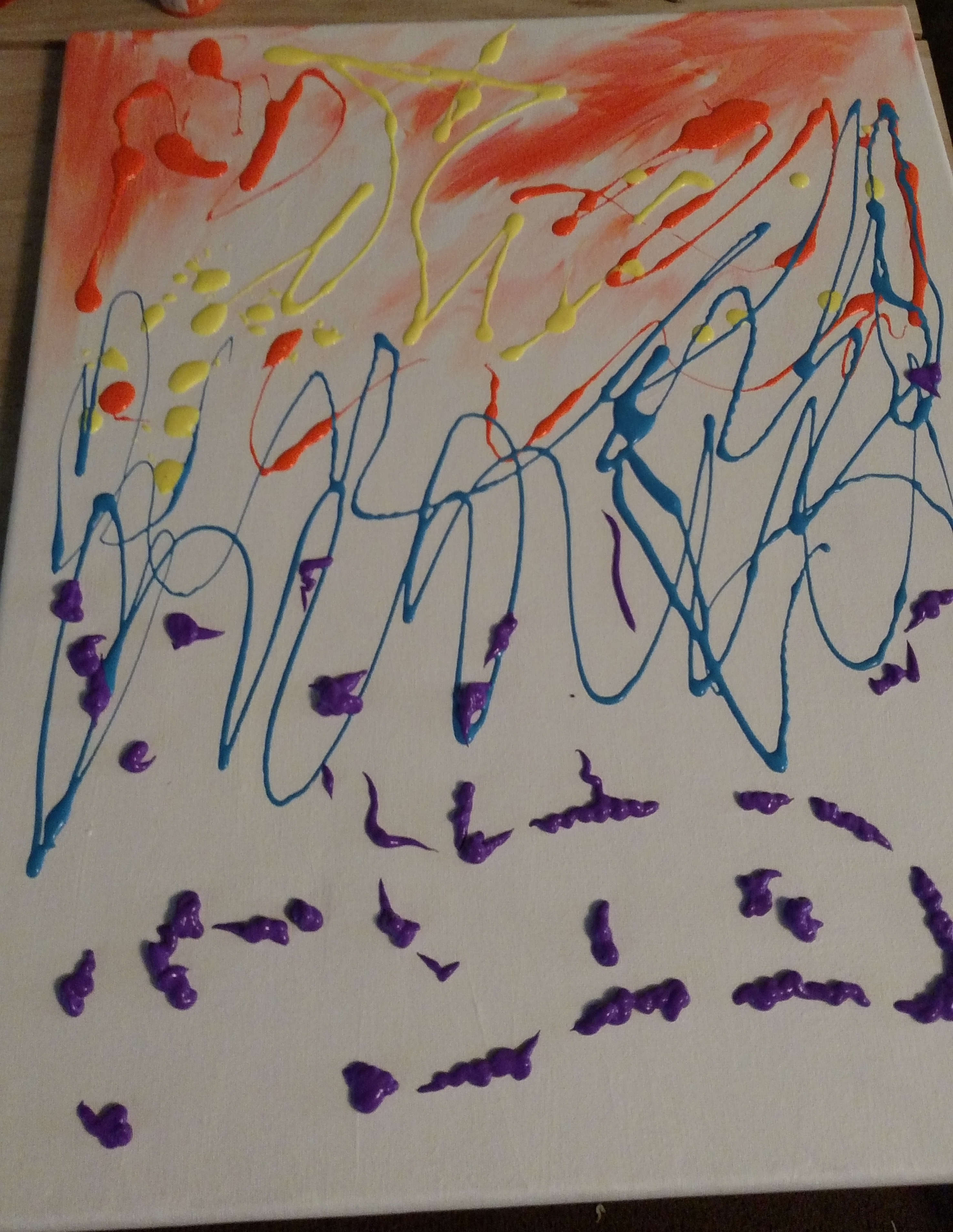 An experiment in color depth and volume. I started by taking a blank canvas and poured on various colors of neon paint. There were to be no lines drawn, and my goal was to try and create depth and motion by only color and brush stroke.